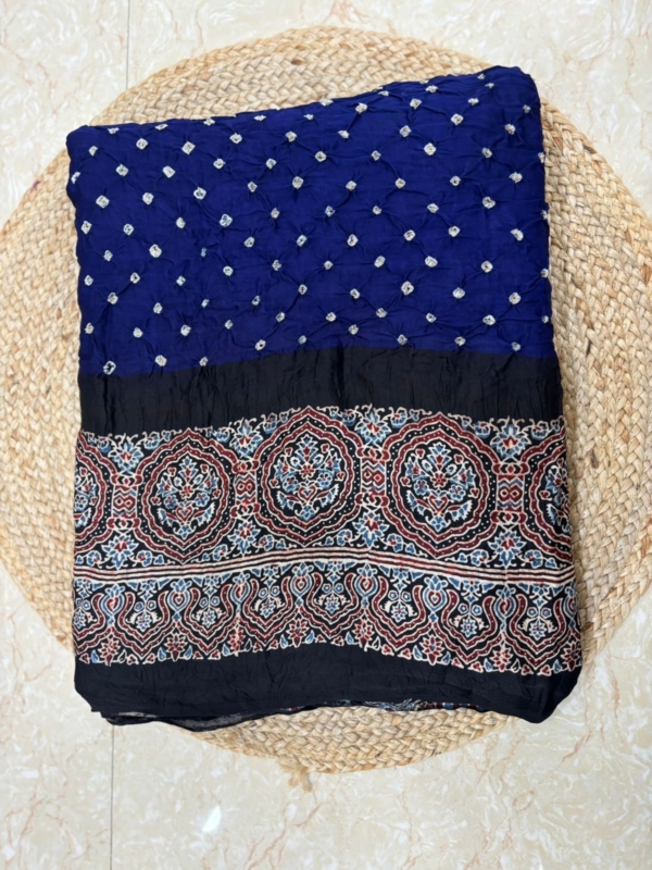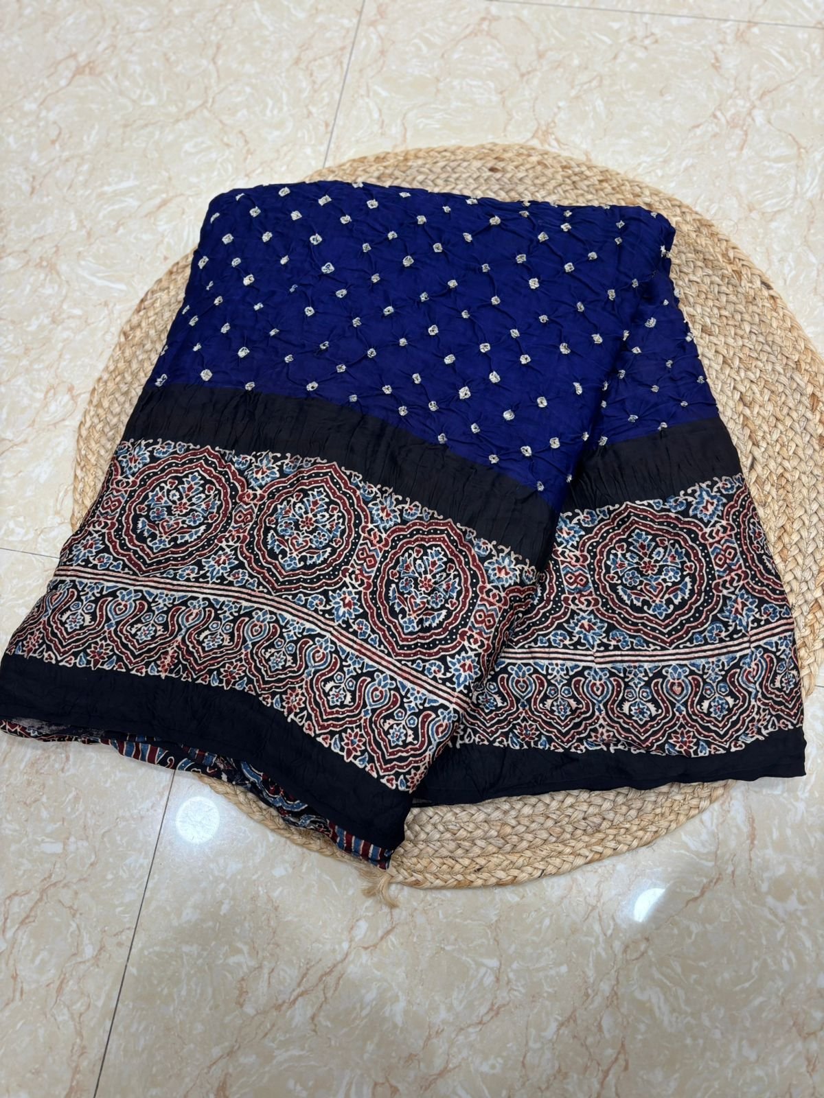 This luxurious silk saree pairs beautifully with gold or oxidized jewelry, enhancing its regal aura. Wear it for weddings, festive occasions, or grand celebrations, and let the rich hues of the Ajrakh Bandini design make a statement. For a more contemporary look, style it with a sleek, modern blouse, while keeping the traditional elegance intact.