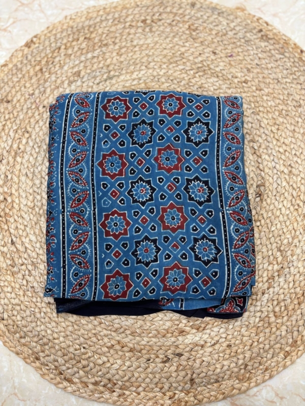 The saree features intricate Ajrakh hand-block printing, a traditional technique that involves stamping the fabric with hand-carved wooden blocks. This process results in symmetrical patterns and geometric designs, often incorporating motifs like stars, flowers, and trellises. The rich color palette, including deep blues, reds, blacks, and whites, is achieved using natural turn0search8**Cultural Significance**