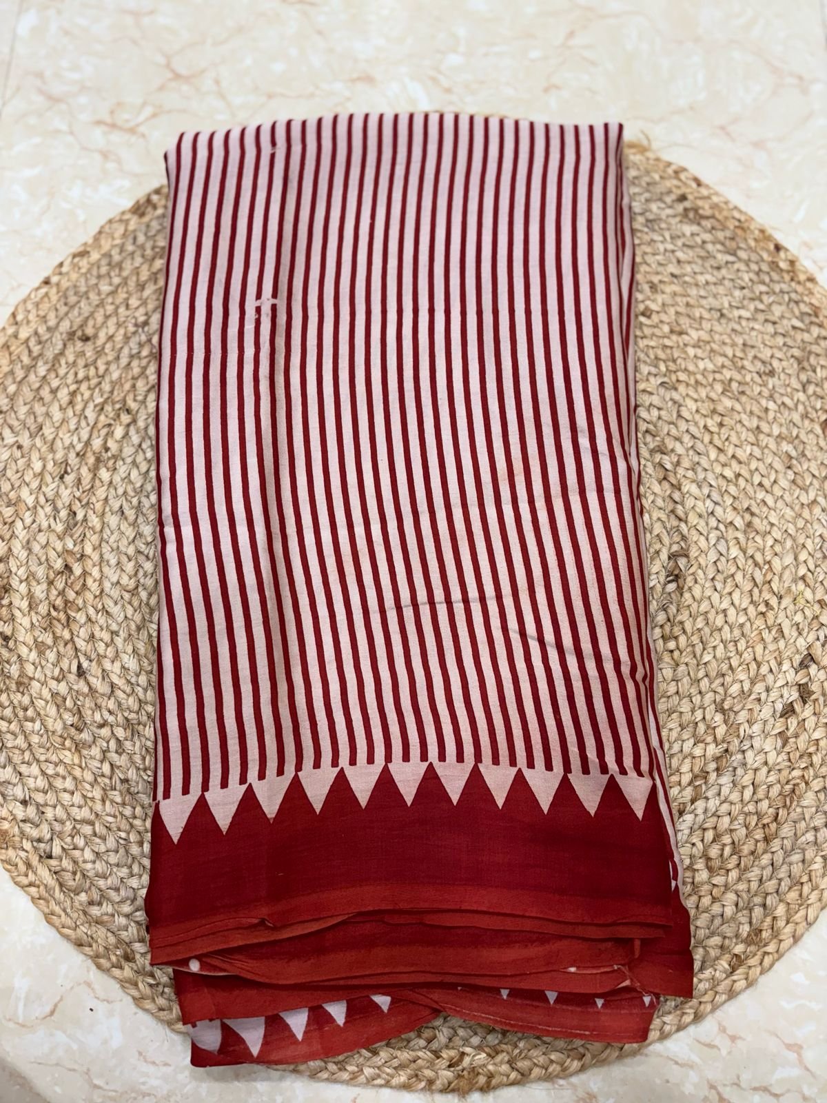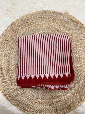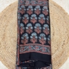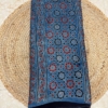 The saree features intricate Ajrakh hand-block printing, a traditional technique that involves stamping the fabric with hand-carved wooden blocks. This process results in symmetrical patterns and geometric designs, often incorporating motifs like stars, flowers, and trellises. The rich color palette, including deep blues, reds, blacks, and whites, is achieved using natural turn0search8**Cultural Significance**