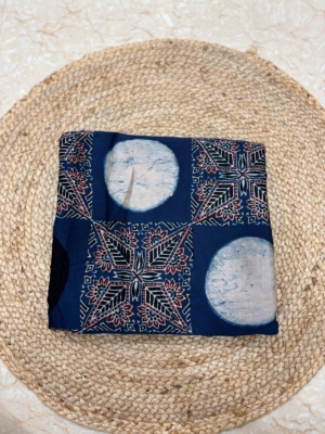 The saree features intricate Ajrakh hand-block printing, a traditional technique that involves stamping the fabric with hand-carved wooden blocks. This process results in symmetrical patterns and geometric designs, often incorporating motifs like stars, flowers, and trellises. The rich color palette, including deep blues, reds, blacks, and whites, is achieved using natural turn0search8**Cultural Significance**